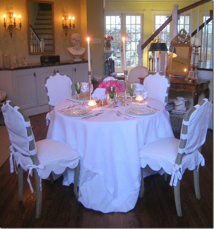 And finally, the blue and white transferware joined the Masonware and is sitting out the next decade. I love the white creamware instead. Will I ever change to a table instead of the skirt? I’ve thought about it, but I love a skirt in a dining room. To me, it’s so romantic and soft looking. Maybe in another house I would change it out, but here – I can’t imagine it.