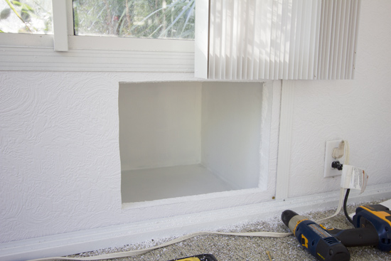 Back inside, we measured our opening and used the jigsaw to cut a hole in the sunroom wall.