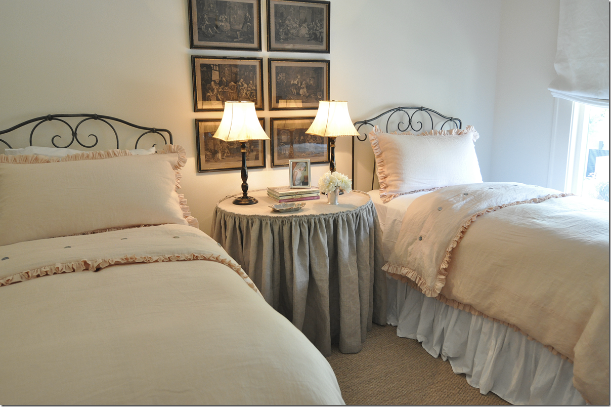 Jane Wood used linens in peach and linen to create a serene bedroom. Cute iron beds are so feminine. I love the mini ruffled trim.