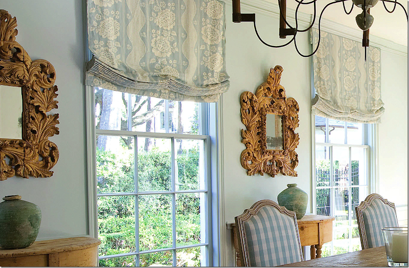 A close up of the mirrors and the linen print at the windows. Love the touch of green in the vases.