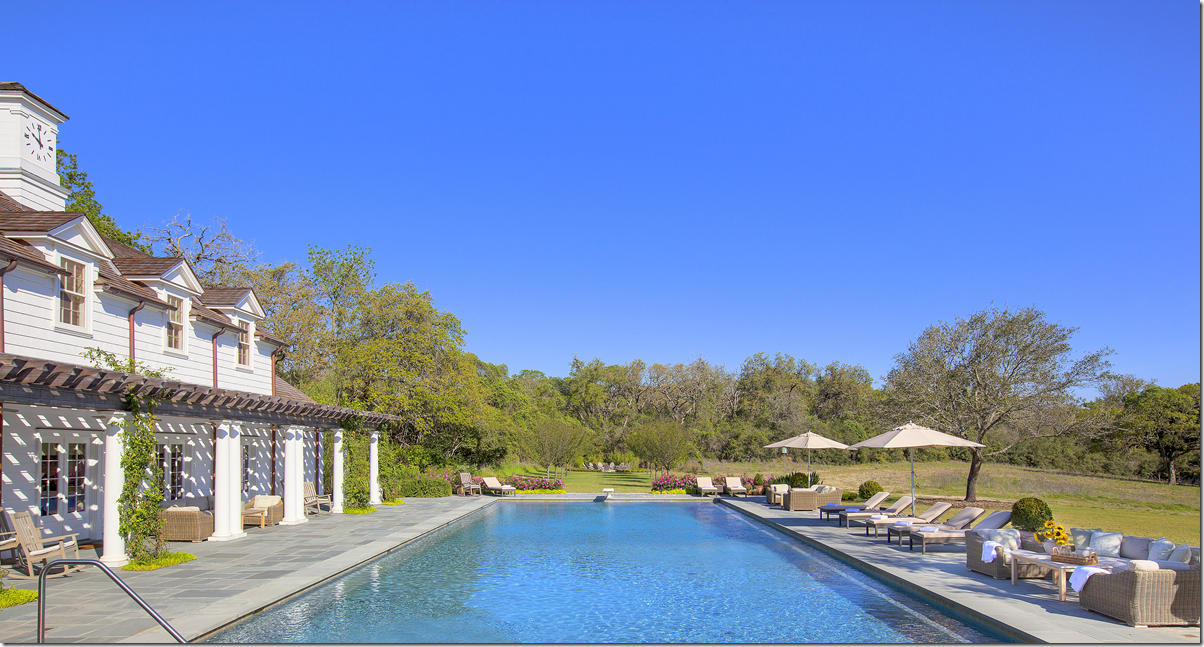 Ginger decorated the pool area as an extension of the house. The printed fabrics are muted Rose Tarlow.
